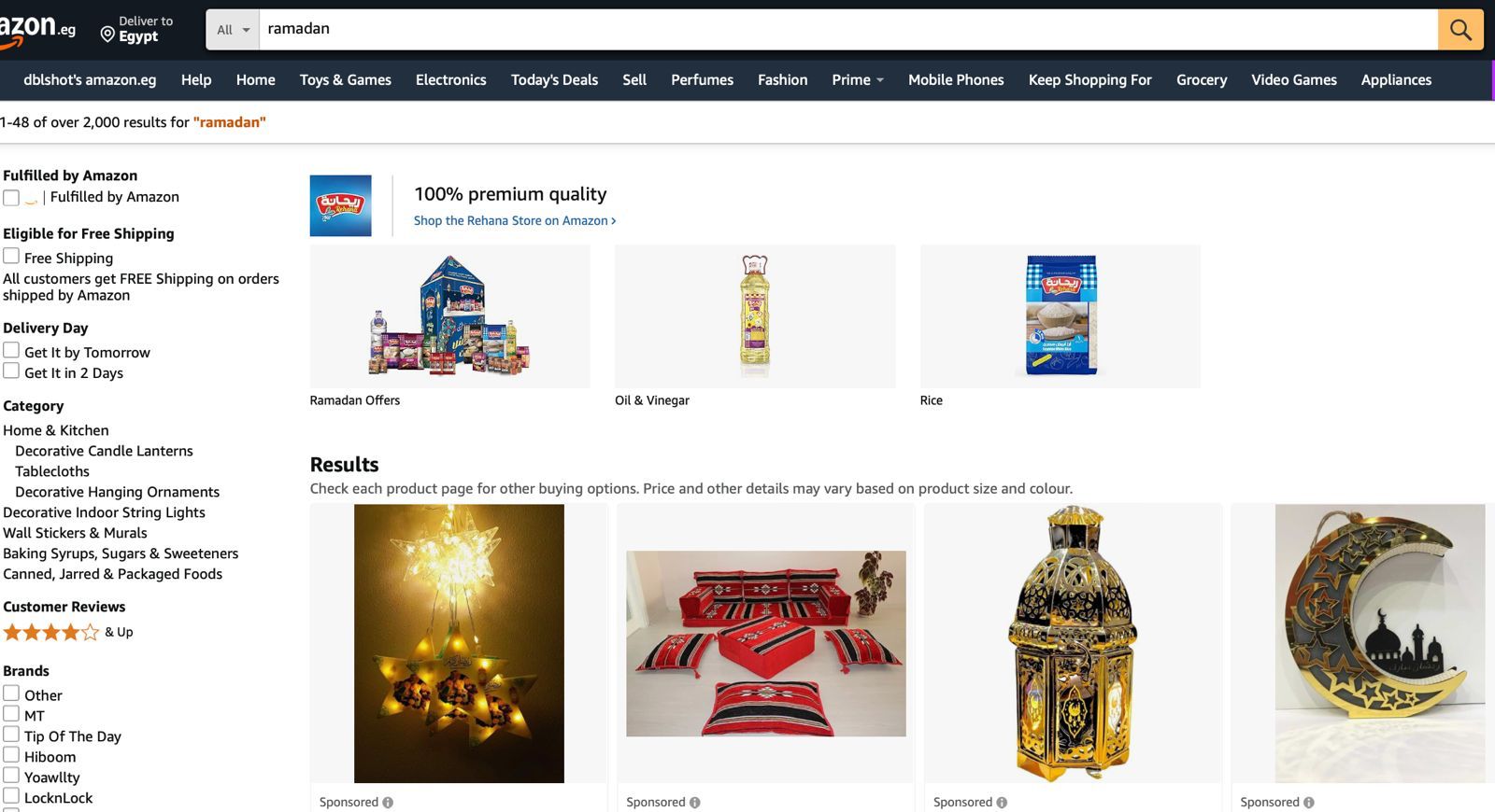 Along with your brand website, you should brand your Amazon & Noon store with Ramadan Theme to be reflect on the seasonality, Amazon provides “Brand Store Building” as a free tool for brands registered on Amazon, all you have to do is to utilize it and make it work to your advantage. As a best practice, it is recommended by DoubleShot People to create a dedicated Ramadan Deals landing page in your Amazon Brand Store. This will allow for users to focus on what’s important during Ramadan and will allow your brand to highlight its seasonal deals.